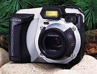 - Fuji "Big Job" DS-260HD - 1.5 megapixel CCD, maximum image size of 1280 x 1024 - 3x optical zoom all-glass Fujinon EBC lens (7.4-22mm, equivalent to 35-105mm on a 35mm camera; macro mode allows focusing down to 10 inches) - Optical and 1.8-inch LCD viewfinders - Ruggedized dust-proof, impact- and water-resistant case - Manual exposure and "Selectable" white balance - Black and White mode - SmartMedia storage (8MB card bundled) - JPEG files (fine, normal or basic compression; 12, 23 or 46 images on an 8MB SmartMedia card) - Built-in auto-sensing flash varies power according to lighting conditions - Power from a bundled lithium ion rechargeable battery - Software bundle includes Adobe PhotoDeluxe 3.0 Home Edition - Dimensions of 5.7" x 4.2" x 3.9", weighs 22.9 ounces - Available immediately at a suggested retail price of $1,199 Photo courtesy of Fuji Photo Film USA Inc.