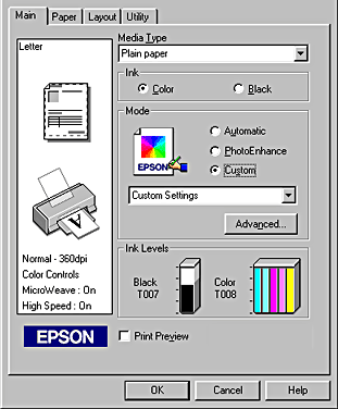 Launching the printer setup utility displays this set of tab-based menu screens. The first is the Main menu, which allows you to set the basic printer parameters, including the type of paper to be printed on, the ink color, and the printing mode. Under the Media Type pulldown menu, you can specify the type of media you'd like to print to. A wide variety of paper choices are available, and are categorized into groups, including Plain Paper, 360 dpi Ink Jet Paper, Photo Quality Ink Jet Paper, Matte Paper-Heavyweight, Photo Paper, Premium Glossy Photo Paper, Photo Quality Glossy Film, and Ink Jet Transparencies.
