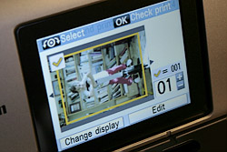 There are two function buttons just below the screen on the control panel. Two boxes on the bottom of the LCD tell you what they do in any particular application. The options with a card installed are Change the Display or Edit. Change the Display lets you view thumbnails or a slide show. You can also enlarge the image, scrolling with the arrow keys until you press OK, or choose full screen or normal displays. Edit lets you trim an image or search for images by date.