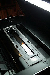 It's actually rather ingenious -- and among the best film holders we've seen. The base holds a removable filmstrip holder. Without the filmstrip holder, the base can accommodate four slides. It doesn't actually "hold" them, though. It merely positions them. You put the base on the platen first (there is a pin and indentations to align it), then drop the slides in, with the emulsion facing up as indicated on the base.