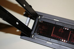 To scan a filmstrip, you open the holder and slip your filmstrip in. Just two small tabs hold down the film end by the hinge until you close the holder so the whole strip lies flat. Nothing rubs against the film as you align it, so there's no danger of scratching the film. Very nice.