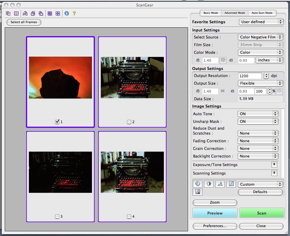 The Advanced tab -- what we used to scan our originals to 1600x1000-pixel images -- can save settings and is a bit more specific about them so you can set the resolution or adjust the color yourself. Image Settings, for example, can toggle unsharp masking and descreening. It can also set the level of dust and scratch removal, fade correction, grain correct on, backlight correction and gutter shadow correction. It's something like a manual mode for the driver compared to Basic.