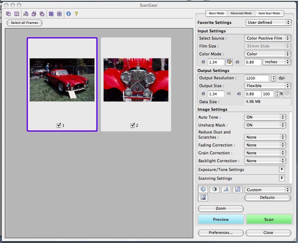 Film Scanning. We scanned a couple of slides of show cars and a color negative using the TWAIN driver from Photoshop CS4. Both kinds of original scanned exceptionally well with good density range and accurate (even improved) color. Density range is usually an issue with a device like this but we were not disappointed in what the MP980 delivered.