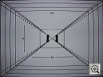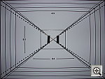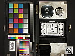 | ISO-12233 (WG-18) Resolution Test High resolution, 1,150 lines of "strong detail." High barrel distortion, but low pincushion. The A1 performed pretty well on our "laboratory" resolution test chart. It started showing artifacts in the test patterns at resolutions as low as 800 lines per picture height vertically, and as low as 600 lines horizontally, but I found "strong detail" out to at last 1,150 lines both vertically and horizontally. "Extinction" of the target patterns occurred around 1,350 lines. One odd note though: For some reason, there were a large number of tiny black specks between the target lines. (These were most visible between the finely-spaced diagonal and horizontal lines, although they were also quite evident between the lines of the hyperbolic resolution wedges.) Given the regular spacing of these artifacts, I have to assume that they somehow result from the A1's image-processing algorithms. I didn't notice these artifacts in any of my "natural" test subjects, perhaps because they only appear to be triggered by very finely spaced, high-contrast detail in the subject. Optical distortion on the A1 is somewhat high at the wide-angle end, where I measured approximately 1.0 percent barrel distortion. The telephoto end fared much better, as I found only 0.3 percent pincushion distortion there. While the distortion at wide-angle is higher than average, the overall results are quite good for a long-ratio zoom lens, as such lenses generally tend to show much higher distortion levels than lower-ratio zooms. Chromatic aberration is very low, showing only very faint coloration on either side of the target lines. (This distortion is visible as a very slight colored fringe around the objects at the edges of the field of view on the resolution target.) The A1's images are also unusually sharp from corner to corner, with very little of the softness in the corners that I've come to expect from digicam lenses. All in all, the A1's lens appears to be of unusually high quality. Resolution Series, Wide Angle