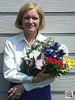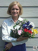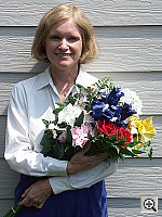 | Outdoor Portrait: Excellent job, great resolution, detail, and color. Contrast is high at the default setting, but the contrast adjustment works quite well.. The extreme tonal range of this image makes it a tough shot for many digicams, which is precisely why I set it up this way, and why I shoot it with no fill flash or reflector to open the shadows. The object is to hold both highlight and shadow detail without producing a "flat" picture with muddy colors, and the DiMAGE A1 performed very well, particularly when I used its contrast-adjustment option. The shot at right makes use of virtually the full range of image adjustments the A1 offers, including a +1.0 EV exposure compensation adjustment, a -2 unit contrast tweak, and a +1 unit saturation boost. The net of all this is a better-than-average handling of the extreme contrast caused by the harsh lighting of this shot, accurate color, and good saturation. The contrast adjustment does just what you'd want it to, holding down the strong highlights, and pulling up the deepest shadows, making it a very useful adjustment to have. - All in all, one of the better jobs I've seen of handling this very tough shot. I chose the Daylight white balance as the most accurate overall, though the Auto setting produced similar results. The Manual setting was close, but had a slight reddish tint. Skin tones look good, and the blue flowers in the bouquet are only a little dark, but quite hue-accurate. (This is a very difficult blue for many digicams to get right, but the A1 gets them almost perfect. For reference, the flowers are a fairly pure light navy blue, with just hints of purple in them.) Color looks good throughout the rest of the bouquet as well, and the strong red flowers have good saturation (bordering on being too intense, but holding good shape nonetheless). Resolution is excellent, with a lot of fine detail visible throughout the frame, even in the shadows. Details are also sharp, and image noise the shadows is quite low. An excellent job all around.To view the entire exposure series from zero to +1.7 EV, see files A1OUTAP0.HTM through A1OUTAP5.HTM on the thumbnail index page. (There's also a full series from 0 to +1.3 EV, with the contrast set down to -2 and the saturation up to +1, as A1OUTCM2SP1AP0.HTM - A1OUTCM2SP1AP4.HTM, and a series from 0 to +1.0 EV with the contrast set down to -5 and the saturation up to +2, as A1OUTCM5SP2AP0.HTM - A1OUTCM5SP2AP3.HTM) To view the entire exposure series at the default contrast and saturation settings, with exposure adjustments from zero to +1.7 EV, see files A1OUTAP0.HTM through A1OUTAP5.HTM on the thumbnail index page. There's also a full series from 0 to +1.3 EV, with the contrast set down to -2 and the saturation up to +1, as A1OUTCM2SP1AP0.HTM - A1OUTCM2SP1AP4.HTM, as well as a series from 0 to +1.0 EV with the contrast set down to -5 and the saturation up to +2, as A1OUTCM5SP2AP0.HTM - A1OUTCM5SP2AP3.HTM | ||||||||||||||||||||||||||||||||||||||||||||||||||||||||||||||||||||||||||||||||||||||