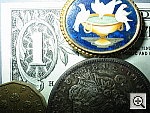 in the coins, dollar bill, and brooch, with high resolution. Details are