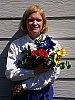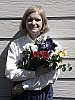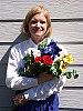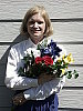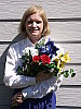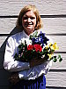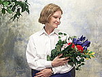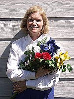 | Closer Portrait: NOTE: These "Closer Portrait" images are from an early production model, that had an image noise problem, and so need to be reshot. (Color and tonality are as on full-spec units, it's just that there are some odd noise artifacts present.) I didn't have time to do this before I left for a (badly needed) vacation, but wanted to (finally) get this review posted, so have left them in here with the caveat to ignore any oddities you might see, noise-wise. - The full-production unit I received to replace this one shows no sign of the odd noise pattern. When I come back, I'll reshoot these using my new "solar simulator" light source, which will become the new standard for these shots. (I hope to get the replacement images up by the beginning of the last week of July.) Excellent resolution and detail, still somewhat harsh contrast. Color and exposure are similar to the wider shot above, and the A2's 7x optical zoom lens does a nice job of preventing any strong distortion. Although the shot at right was taken with no exposure compensation adjustment, it was actually a little darker than the shot I took at -0.3EV. While midtones are about right, the highlights are again very bright and shadows are a little dark. Detail is outstanding though, with sharp details in Marti's face and hair (probably quite a bit more than she would care to see on-screen). You can even see a little of the weave of the fabric in the blue flower petals. Detail in the shadows is again very good, this time with little or no sign of the odd diagonal noise pattern in the darkest areas that I saw in the shot above. An excellent job overall. To view the entire exposure series from -0.3 to +0.3 EV, see files A2FACAM1.HTM