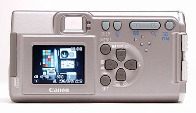 The lens is a fixed focal-length design, but a maximum 4x digital zoom is available. Do keep in mind though, that digital zoom shouldn't be compared with an optical zoom lens because it always reduces image quality, simply cropping out and enlarging the center pixels of the CCD's image. Focus is automatically controlled, and ranges from 7.9 inches (20 centimeters) to infinity in normal mode, and from 2.0 to 7.9 inches (5 to 20 centimeters) in Macro mode. (The A200 has very good macro capability for an entry-level camera.) An Infinity fixed-focus mode is also available. The A200 employs the same sophisticated, three-point AiAF (Artificial Intelligence Autofocus) system used to determine focus on Canon's higher-end models, providing three focusing points spread across a broad active area in the center of the image to calculate the focal distance. You can also switch to a spot AF mode, which judges focus based on the subject appearing in the very center of the center of the frame. I've always found Canon's AiAF system to be quite accurate, especially with subjects that are a bit off center. (The sophisticated autofocus system is another surprising plus for an entry-level camera.) Also built-in to the A200 is an AF assist light, which aids the autofocus system in low lighting. The A200 has an "inverted Galilean-type" optical viewfinder, as well as a 1.5-inch color LCD monitor. I confess I'm not sure just what "inverted Galilean-type" means in the context of optical viewfinders, but I recognize the type used on the A200, and it isn't one of my favorites: The boundaries of the frame are somewhat indistinct, so there's just a bit of guesswork involved in determining what will appear in your picture and what wont. That said, the optical viewfinder on the A200 actually doesn't do too badly, although I found the image in it to be shifted upward a fair bit relative to what was actually captured by the camera. For its part, the LCD monitor is very accurate, and it displays a fair amount of camera information, although not aperture or shutter speed.