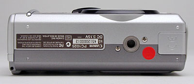 The opposite side of the camera holds the USB and DC-In jacks, protected by a snug rubber cover. Also on this side is the slot for the date/time backup battery, a CR2016 lithium cell.