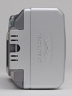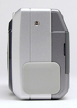 On the right side of the camera (as viewed from the back) is the plastic door that covers the memory card and battery compartment. The compartment interior is divided into two sections, with a hinged plastic retainer clip covering the battery slots themselves. The hinge of the outer compartment door also serves as the eyelet for the included wrist strap.