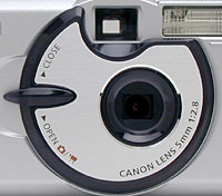 The A200 has a 5.0mm fixed focal length lens, with a maximum aperture of f/2.8. The focal length equates to a 39mm lens on a conventional 35mm camera, a slight wide angle. A large disc around the lens controls the built-in lens cover, and also turns the camera on or off in capture mode. I don't think I've seen this particular design on a digicam before, but it works quite well. A tab extends from the left side of the disc (as viewed from the front of the camera), serving as a finger grip. Pressing down on this tab rotates the disc slightly, opening the lens cover and turning the camera on in capture mode. Pressing the tab up rotates the disc in the other direction, closing the lens cover and turning the camera off. I really like built-in lens covers like this, as they eliminate the problem of lost lens caps.