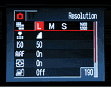 - Resolution: Sets the image resolution to Large (1,600 x 1,200 pixels), Medium (1,024 x 768 pixels), or Small (640 x 480 pixels) for still images. Movie resolution options are 320 x 240 and 160 x 120 pixels.