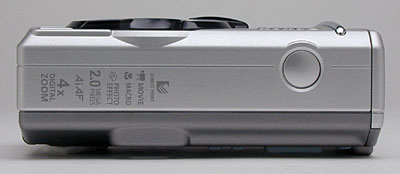 The front of the A200 holds the lens, optical viewfinder window, and flash unit. The lens cover/power switch disc (a little to the right of center) has a charcoal-colored edge, and rotates to simultaneously power the camera on and open the lens cover. Once the camera is turned on, rotating the disc a second time puts the camera into Movie mode. (Pressing again takes you back to Still recording mode.) Rotating the disc in the other direction turns the camera off and closes the lens cover. The flash window also houses the super-bright LED that serves as the AF assist lamp, red-eye reduction lamp, and self-timer indicator. A small, chromed ridge running vertically along the camera's left side serves as a finger grip.