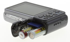 For power, the PowerShot A2000 IS uses two AA type batteries, and comes with a set of ordinary alkaline cells. Performance is much better with NiMH rechargeables (approximately 500 shots compared to 240 shots with alkalines), so I heartily recommend picking up a spare set of rechargeable batteries and a good charger. (Read our Eneloop battery review, and check out our review of the Maha C-204W NiMH battery charger, our current favorite.)
