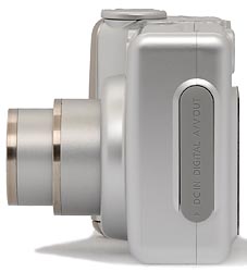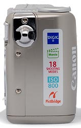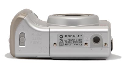 On the opposite side of the Canon A530 is the connector compartment, covered by a flexible, rubbery plastic flap that snaps in and out of place. When opened, the flap remains connected to the camera body, and folds out of the way to accommodate cables. Inside the compartment are the DC In, Digital (USB), and A/V Out jacks.