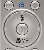 Multi-Controller Rocker Button: The Canon A530's four-way rocker button isn't marked with arrows, but actuates left, right, up, and down, simulating arrow keys to navigate through settings menus. In Record mode, the left and right buttons adjust available exposure settings, as well as manual focus, when enabled. The top button controls flash mode, while the bottom button accesses Macro and Manual Focus modes.