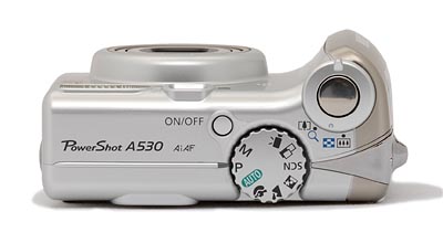 Zoom Ring (see image above): Surrounding the Shutter button on the Canon A530's top panel, this lever controls the optical and digital zoom while in Record mode. In Playback mode (when not using the playback zoom), the wide setting displays a nine-image index display of all images on the memory card, and accesses a "Jump" function that lets you scroll through index display screens quickly. Alternatively, the magnify position enlarges the currently displayed image as much as 10x, so that you can check on fine details.