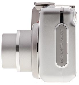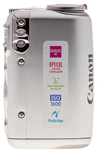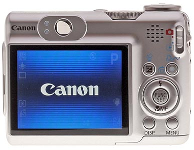 On the back panel, the 2.5-inch LCD takes up the lower left. Just above it is the optical viewfinder with two LED status lamps. In the right corner is the camera's speaker and just right of that, on the far right edge, is the Mode switch, with settings for record and playback. The main control buttons are just to the right of the LCD below the speaker. The Function/Set button is surrounded by a four-way navigator with Macro and Flash controls. Above the navigator are the EV/Erase button and Print/Share button. Below it are the Display and Menu buttons. It's a configuration familiar to Canon fans for some time now.