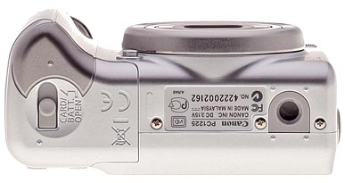 The A570 IS has a flat bottom with a plastic tripod mount to the right and the battery/memory card compartment to the left covered by a sliding plastic cover than can be locked. In addition to the memory card, the battery compartment holds the AA cells and a small CR1220 battery in a plastic drawer that keeps the clock ticking when you pop the batteries out.