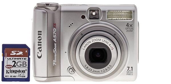 The Canon A570 IS looks bigger than it really is, no doubt because of its boxy shape. But the 3.52 x 2.53 x 1.69 inch (89.5 x 64.3 x 42.8mm) shell weighs only 8.32 ounces (236 grams) with two AA batteries and an SD card installed. It's stocky but small enough to fit in a coat pocket to tag along anywhere. The body design is almost identical to the A550.
