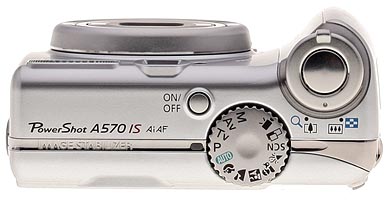 The top panel of the A570 IS bunches the controls on the right side. At the top of the grip, on the forward part of the panel, the Shutter button is surrounded by the Zoom Lever. Extending just a bit past the back edge of the panel, the Mode dial is behind and to the left of the Shutter button. Just to the left and forward of that is the small Power button. The very small Power lamp sits just to the left of the Mode dial.