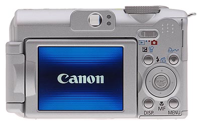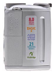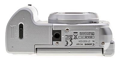 The rear panel is dominated by the 2.5-inch LCD housing that flips away from the back. Once opened all the way, the LCD monitor can swivel around to face the front of the camera, or point toward the bottom panel. What's nice about this design is that you can turn the LCD monitor in toward the camera back and close it, thereby protecting it from scratches and smudges when you stash it in a pocket. The eye-level optical viewfinder features two LED lamps that report camera status. To the right of the LCD are the main controls. At the top, just left of the thumb grip, is the Mode switch (with Record or Playback options). Below that are the Exposure Compensation/Erase and Print/Share buttons. The larger control just below these is the navigator ring, which rocks up and down, left and right. The up button cycles through the Flash modes in Record mode, or displays the Jump menu in Playback mode. The down button cycles through the focusing modes of Macro, Manual, or Auto. The left and right buttons adjust parameters depending on the shooting mode. In the middle of the navigator is the Func./Set button that confirms menu choices and calls up the Function menu in Record mode. Below the controller are the Display and Menu buttons.