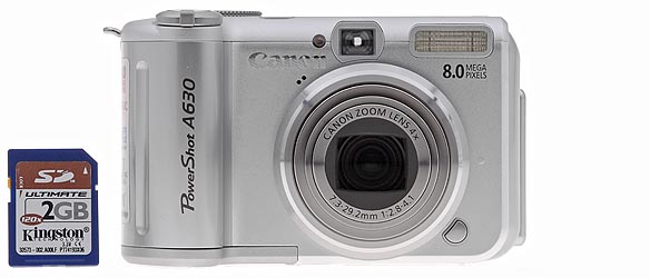 A bit larger than palm size, the Canon A630 has an attractive plastic silver shell with chrome highlights. It doesn't pretend to be jewelry, though. It's a camera and proud to be one. The grip and lens predominate from the front and the LCD and controls dominate the back. Simple as that. At 11.85 ounces (336 grams) it is neither heavy nor light, and its measurements of 4.31 x 2.60 x 1.93 inches (109 x 66 x 49 millimeters) make it large, but it will still fit into larger coat pockets and purses. Given its grip and heft, you won't induce camera shake merely by pressing the Shutter button, as you do with featherweight digicams. But you won't need a massage after carrying it around all afternoon, either. It's a well-balanced design.
