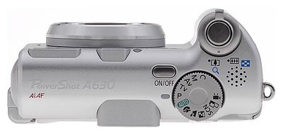 The Canon A630's top panel has the Shutter button, surrounded by the Zoom lever, on the top of the protruding grip. Behind those and to the right is the speaker grill. Just left and rear of that is the Mode dial with 12 shooting positions divided by Canon into three basic categories: Auto Exposure, Image Zone, and Creative Zone. The Power button is just left and forward of that.