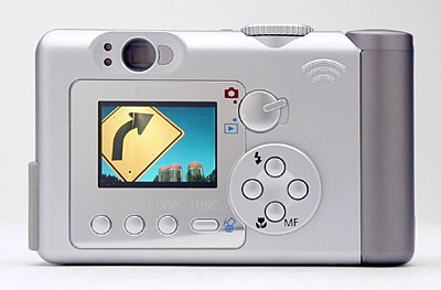 The rest of the exposure controls are located on the camera's back panel, along with the optical viewfinder and LCD monitor. The eye-level optical viewfinder features two LED lamps that report camera status. A Mode switch puts the camera into Playback or Record modes, and is adjacent to the top right corner of the LCD monitor. Below the Mode switch is a four-button pad that operates similarly to the round arrow pads found on other digital cameras. Although the keys don't feature arrows, they operate in the same manner when navigating settings menus. The top button also controls flash mode, while the bottom button accesses Macro and Manual Focus modes. Lining the bottom of the LCD display are the Set, Menu, Display, and Function / Erase buttons.