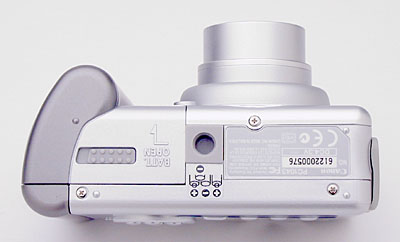 The A70's bottom panel is reasonably flat, with a sliding door to access the battery compartment and a threaded plastic tripod mount at about center. Because the battery door and tripod mount are so close to one another, it would be difficult to make quick battery changes while working with a tripod, something I always look at, given the amount of test shooting I do in the studio. On the other hand, Canon's AC adapter plugs into the side of the camera. Thus, for studio use, there's a convenient way to get power to the camera while on a tripod.