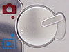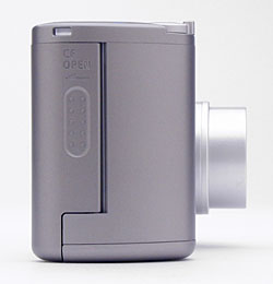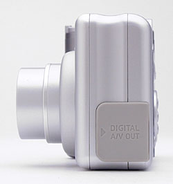 On the opposite side of the camera is the connector compartment, covered by a flexible, rubbery-plastic flap that snaps in and out of place. When opened, the flap remains connected to the camera body, and folds out of the way to accommodate cables. Inside the compartment are the Digital (USB), A/V Out, and DC In jacks. Also inside the compartment is the CR1220 battery slot, which pulls out from the camera body and holds the small CR1220 lithium battery that powers the camera's internal memory (preserving the clock and calendar settings, as well as current exposure settings, when the main AA batteries are removed).
