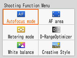 Function Menu and Help Guide display. Pressing the Sony A230's Fn (Function) button brings up a simple menu for adjusting most of the important items in both Record mode and Playback. Just use the Arrow pad to navigate to the desired option and press the center button to select your mode. If you stay on a given item for a moment, a plain-text explanation of each item pops up.
