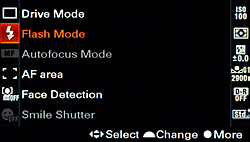 The Flash mode is changed from the Function screen. In Auto flash mode (available only in the camera's Auto or Scene Selection modes), the camera automatically determines when to fire the flash based on the existing lighting, and will pop-up the flash automatically. In Fill-Flash mode, the flash fires with every exposure, regardless of lighting conditions. Slow-sync mode fires the flash for foreground fill exposure, while allowing the background to burn in. The Rear Flash Sync mode fires the flash at the end of the shutter time, rather than the beginning. If you have moving objects in the scene with lights, such as a passing car, this will produce a sharp image of your subject, with a "motion trail" following behind it when shooting at slower shutter speeds. The flash is off when Flash Off mode is selected, or when the flash is down in non Auto exposure mode.