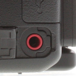 External Mic. The Sony A33's optional external stereo mic plugs into a standard 3.5mm jack under a rubber flap on the left side of the camera body.
