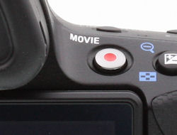 Video capability. There is no separate video recording mode on the Sony A33: Video can be initiated from any still-capture mode by pressing the video Movie button on the angled rear face of the body.