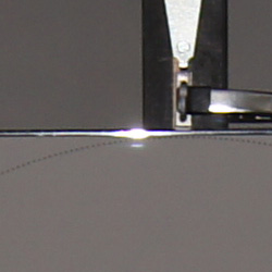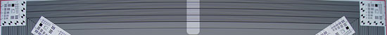 When additional surfaces are added to an optical path, especially ones not parallel with the image plane, there is always a chance that light will travel an unintended path. In the case of the A55V and A33, it appears that the rear surface of the translucent mirror film can reflect light back to the front surface of the film, which reflects it back to the rear, causing a "ghost" reflection or multiple reflections to appear in the final image under certain conditions. The above left crop shows this phenomenon in one of our Sony A55V flash test shots, where a very strong reflection from the plastic edging of our flash-range/uniformity target also has a small ghost image in the form of a horizontal white line below it. (Thanks to IR reader Erick E for pointing this out in one of our flash range images!) The crop on the right is from a similar flash shot, taken with the same lens, but using the Sony A560 which is a traditional SLR without a translucent mirror in the optical path. As you can see, under nearly identical conditions (the A560's flash is a bit stronger), no ghosting is present.