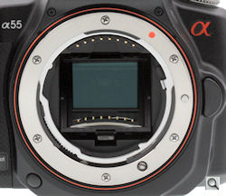 Alpha lens mount. Despite the new translucent mirror design, the Sony A55's Alpha lens mount is compatible with the full array of Alpha lenses, both screw-drive and electronic autofocus models.