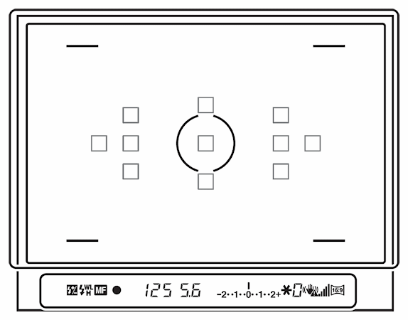The Sony A580's extensive information display features a series of focus target marks in the center of the view that highlight briefly when the AF system is activated. Against uniform, light backgrounds, extremely fine lines can be seen leading up to each active target mark from the left or right sides of the frame, but these aren't in the least obtrusive. Note that, while the autofocus sensor has fifteen individual focusing points, only eleven of these are manually addressable, and only these points' locations are shown in the optical viewfinder. For those familiar with older Sony SLRs, it's also worth noting that while the AF point displays are now all boxes, only three AF sensors at the center of the frame are cross types, with the remainder being line-type sensors.