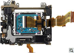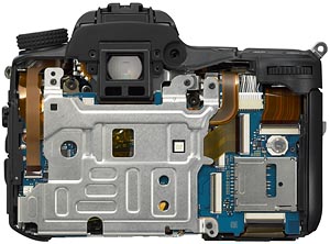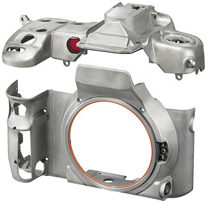Chassis Components. The castings are only the most prominent parts of a digital SLR body, though, there's always a lot of internal sheet metal and smaller parts that help hold everything together. In the shots above, we see front and back views of the camera with its body panels removed. In the shot of the front, it's a little hard to tell what all the pieces are made of, but judging from the metal color, the sheet metal on the left looks like stamped magnesium alloy. There appears to be a chunk of polycarbonate molding on the right side. Sony told us that some of the inner components of the camera are made from aluminum, to save weight, primarily in pieces that the body panel components mount to. In the shot of the back of the camera above, the large hunk of sheet metal looks like stamped sheet metal.
