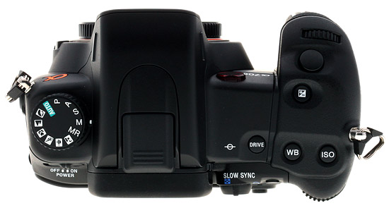 On top Sony took a minimalist approach, omitting the EV compensation dial on the left and moving the Mode dial to the left in its place. Though it's clear that there would be more space for a status LCD here, Sony stuck to the integrated status LCD on the A700, which does indeed offer that interactive graphical menu. Though I'm fine with the Drive, White balance, and ISO buttons here on the top deck, it is notable that it's more difficult to access these controls unless you take your hand off the Sony A700's main grip. Nevertheless, if you want to keep your hand on the grip, you can use the Multi-controller in combination with the gorgeous rear Status LCD display and make your changes to these items and many more.