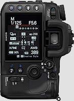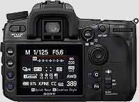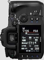 The latest batch of digital SLR camera announcements from the major makers all seem to include large, high-resolution LCD screens, and the Sony A700 follows that trend. It's a 922,000 pixel screen (counting as usual the red, green, and blue elements as individual pixels), measuring three inches diagonally. It also has a very wide viewing angle, although Sony hasn't yet given a spec for this. Just playing with it, though, we felt we could still see the screen +/- 85 degrees from straight on, so that'd make (very roughly) a 170 degree viewing angle.