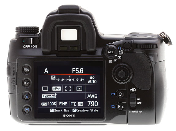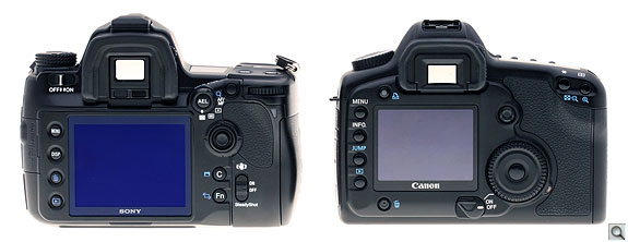 The rear of the Sony A900 is laid out identically to the Sony A700. Positions are slightly different, with the LCD taking up less of the overall space, mostly because there's more width overall. The left side tapers away just left of the LCD, somewhat minimizing the bulk of the bulge at the left, giving your nose a little break as well, as you move your right eye up to the viewfinder.
