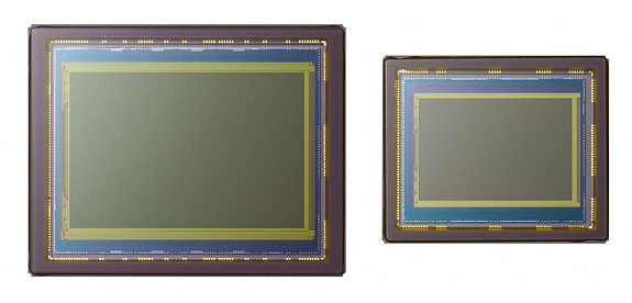 Sensor. Sony's Exmor CMOS sensor is what gives the Sony A900 its magic. Above you can see how the A900's size compares to the Sony APS-C-sized sensor. Its pixels are actually larger than the Sony A700's 10-megapixel sensor, which should make for greater ISO sensitivity. The 24.6-megapixel sensor is more than just a sensor, however, as it includes the analog to digital (A/D) conversion circuitry right on board the chip. Over 6,000 A/D converters work in parallel to convert the image data before electronic noise can take hold. That makes for fast data acquisition too.