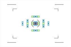 AF Sensor array. Blue points are the main AF points, oriented in the direction shown. The green blocks are the supplemental AF points.