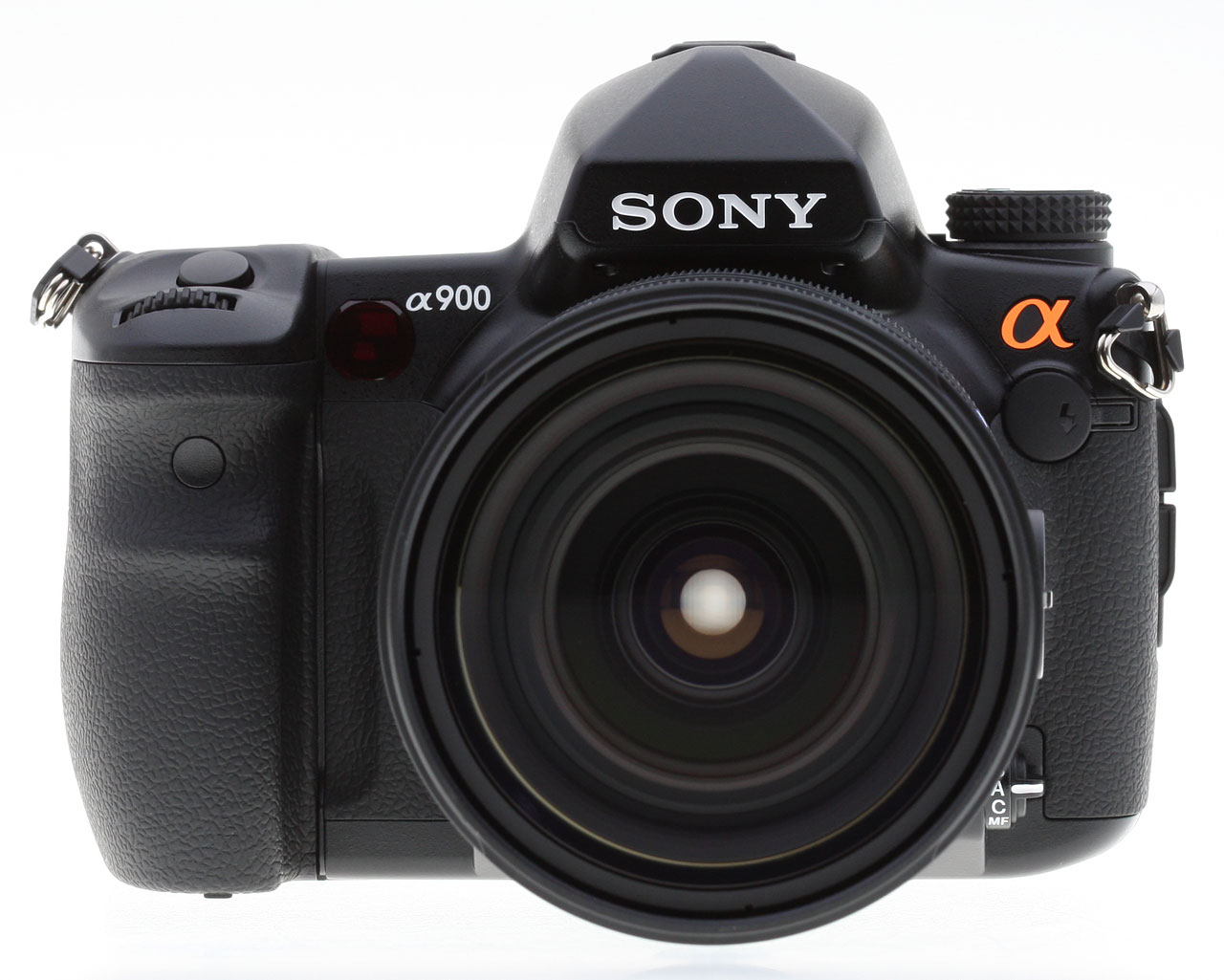The Sony A900's front panel looks a lot like the A700, though the handgrip bulges a bit more into the hand, and the Mode dial is positioned straight and level, while the A700's was mounted at a slant. Missing from the front of the grip is the Grip-sensor that was part of the Eye-start AF system.