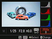 Touching the Custom button (marked with a C) toggles on the Histogram screen, along with most of the exposure data. You get not just a luminance histogram, but red, green, and blue as well to help you gauge color casts.