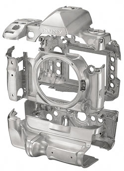 Body. The Sony A900's body is magnesium alloy, with large openings for the LCD and lens mount, as well as a cutout for the card door. The battery grip is also magnesium alloy, as shown here. The overall feel is quite solid. The body is sealed against moisture, as are the buttons and dials.