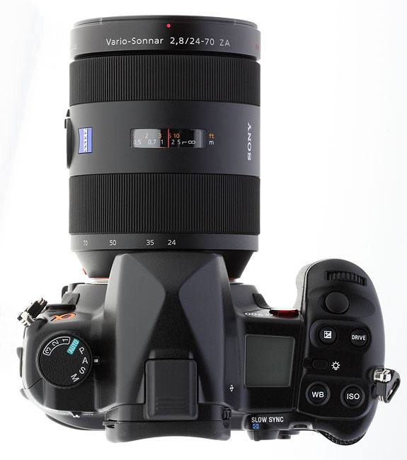 Shown here with the big, beautiful Zeiss 24-70 f/2.8 zoom lens, the Sony A900 has a fitting, if high-dollar, mate. We shot extensively with this lens, and found it to be better than satisfactory, worthy of the A900. It also balances out the A900's big body. See our review of this $1,800 lens on SLRgear.com.