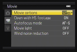MOVIE. Don't look for Movie mode. There isn't one. The only way to shoot a movie is to press the Movie record button (or, with Action Control active, to use a gesture). A tab on the Menu system lets you preset Movie options no matter what shooting mode you've selected.
