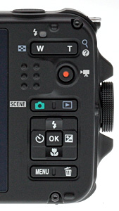 The four-way navigator uses the arrow keys to control Flash with the Up arrow, EV with the Right arrow, Macro with the Down arrow, and the Self-Timer with the Left arrow. A conventional arrangement.